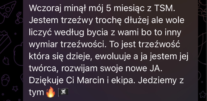 „Dobiega mój 3 miesiąc trzeźwości. Poza zwykłymi zmianami jak utrata wagi czy poprawa sylwetki zmienił się mój mental. Metoda Marcina naprawdę działa”